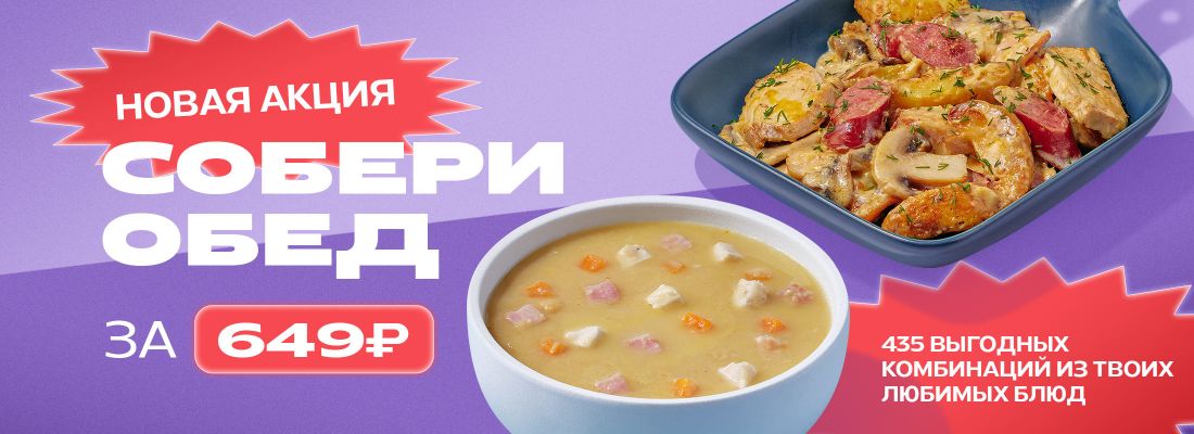 Акция «Собери обед» за 649₽. Выбирай 2 блюда из подборки и заказывай по выгодной цене. Больше 190 комбинаций для твоего идеального обеда!